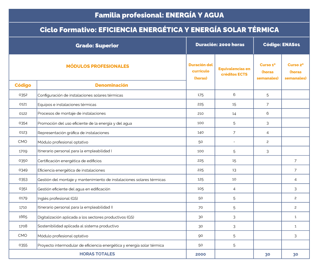 La duración del Ciclo Formativo es de 2.000 horas distribuidas en 2 cursos académicos en los que se incluyen las 500 horas de Fase de Formación en Empresas (FFE).